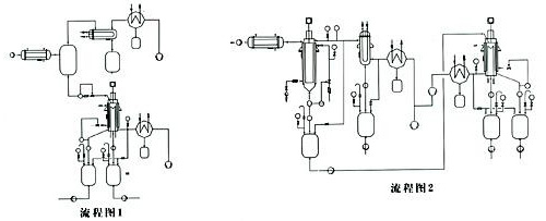 大量的低沸物在刮膜蒸發器里被除去,產品的蒸餾在后級的短程蒸餾器里產生(流程圖2)。