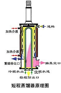 短程蒸餾器由外加熱的垂直圓筒體、位于它的中心冷凝器及在蒸餾器和冷凝器之間旋轉的刮膜器組成。